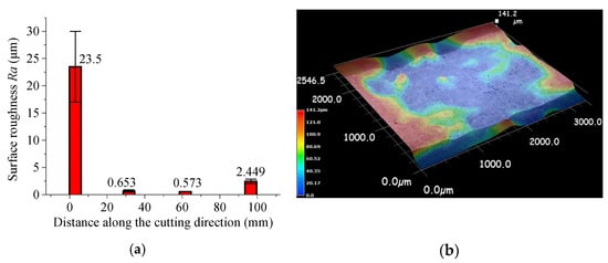 Figure 11 shows the effect of microwave power on Ra under the condition of a cutting speed of 3 mm/s at several positions along the cutting direction. It indicates that the surface roughness of each position increases as the microwave power increases. The microwave power has a significant impact on the surface roughness of the initial segment. When the maximum microwave power is 1300 W, the surface roughness of both the initial and final segments will increase significantly. Therefore, it is necessary to choose an appropriate microwave power when using a surface heat source for cutting.