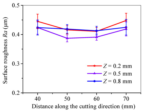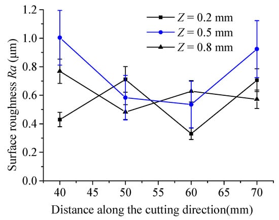 Figure 10 shows the variation in surface roughness Ra in the thickness direction of the workpiece. As is shown, the average Ra at most points is between 0.2 μm to 1 μm. It is notable that there is a significant difference in Ra along the depth direction at various cutting positions without obvious regularity.
