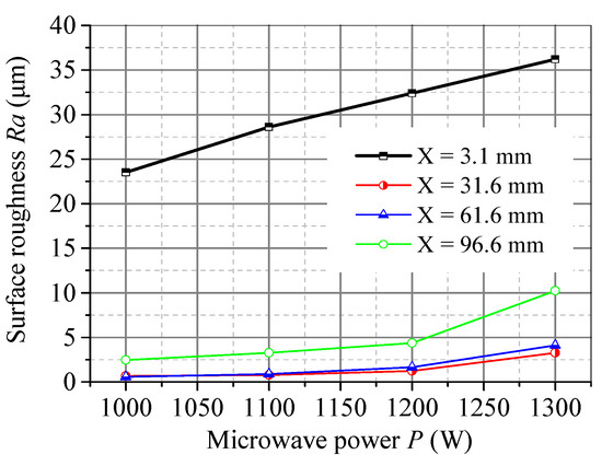 Effect of microwave power on the surface roughness along the scanning direction at different positions in the middle depth of the material.
