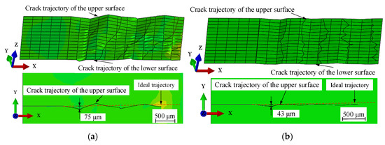 The cutting simulation was conducted for both surface and volumetric heat sources. Figure 12 shows the simulation results of crack propagation for cutting Al2O3 ceramics by a microwave surface heat source and the crack propagation for cutting glass with a volumetric heat source. From Figure 12a, it is notable that the crack propagates inconsistently between the upper and the lower surface of the workpiece. The crack propagation on the upper surface presents a significant folding line, while the lower surface is relatively straight. From Figure 12b, it is notable that that the crack-propagation paths on the upper and lower surfaces of the workpiece are consistent under the action of a volumetric heat source, and the crack-propagation paths tend to be straight.