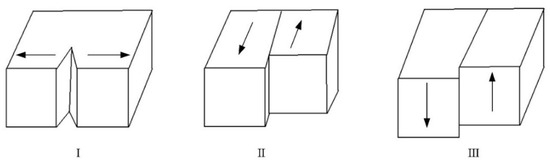 There are three basic modes of crack propagation and fracture, which are type I (open), type II (sliding), and type III (tear). Figure 14 shows a schematic of these three basic fracture modes. Among them, type I means that the crack only breaks under the action of tensile stress perpendicular to the fracture surface; type II means that the crack breaks only under the action of longitudinal shear stress perpendicular to the leading edge of the crack; type III means that the crack breaks only under the action of lateral shear stress parallel to the leading edge of the crack.