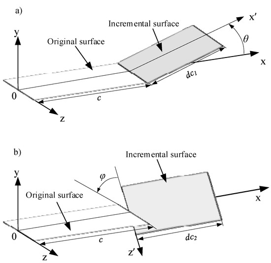 The main reasons for the occurrence of offset propagation of cracks are divided into “inclined” type (type I and type II composite) fractures or “torsional” type (type I and type III composite) fractures. Figure 15 shows the schematic diagrams of these two typical types. It adopts the same coordinate system and crack location as the simulation calculation, where the “inclined” type in Figure 16a refers to the original crack surface producing a deflection angle θ relative to the original propagation direction under the influence of transverse shear force, and an extended length dc1 of the included angle. The “torsional” propagation in Figure 15b is caused by the influence of lateral shear force on the original crack surface, resulting in a deflection angle φ relative to the original propagation direction, and the extended length dc2 of the included angle.