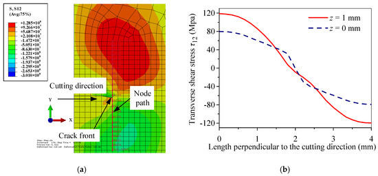 Figure 16 shows the distribution of transverse shear stress , which is perpendicular to the cutting direction at the crack front at t = 1.9058 s. To obtain effective data, a grid segment with a length of 2 mm was symmetrically taken on the front edge of the crack perpendicular to the initial crack plane, and the center position of this segment is the ideal position for the crack propagation without deviation. The number of selected nodes is 23, and the path direction of the selected nodes is in the positive y-axis direction. As is shown in Figure 16a, the crack on the upper surface of the workpiece shifted to the right. Figure 16b shows that of the upper surface changes more significantly than the lower surface, which is caused by the surface heat source being located on the upper surface of the workpiece. It is notable that the intersection of the curve and the 0 MPa line is close to the right side of the symmetry line. According to the theory of fracture mechanics, the crack always tends to propagate where the shear stress is the smallest, so the upper surface crack has a deviation to the right.