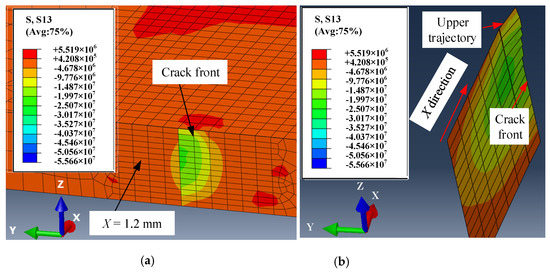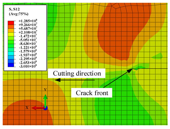 In order to study the mechanism of deviation of crack propagation in a surface heat source-induced thermal fracture, it is necessary to analyze the two kinds of shear stress near the crack that cause the migration. These are S12 and S13 in the output of the simulation results, which present the shear stress causing “inclined” propagation and shear stress causing “torsional” propagation.