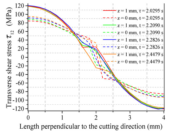 The gradient of transverse tensile stress along the thickness direction of the material indicates that crack propagation is severely asynchronized at different positions of the cross-section. As was reported in [18], the propagation first occurs from the root of the existing crack on the upper surface, and the crack expands to the lower surface along the thickness direction. The incentive for its subsequent expansion is that the expanding crack forms a new tip with the existing crack in the vertical direction, which has the minimum curvature radius and the most concentrated stress to guide the crack to propagate downwards. This crack-propagation mode results in the uneven distribution of the fracture quality in the cutting experiment.