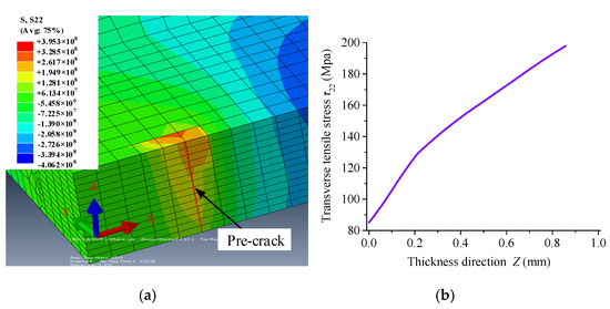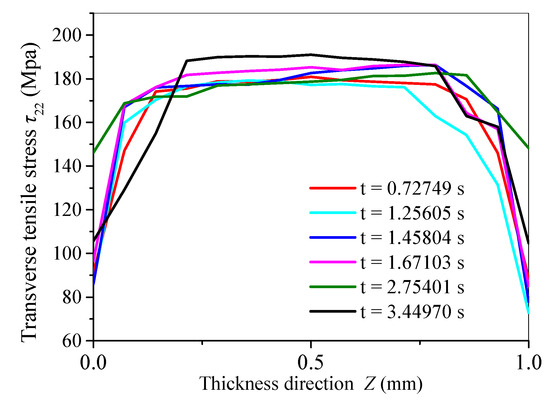 Figure 22 shows the transverse tensile stress at the crack front along the direction of material thickness at the moment of propagation under the action of a dual-surface heat source at different times. As is shown, the maximum transverse tensile stress zone under the action of a dual-surface heat source is located at the middle section of the crack root. This indicates that the difference in the maximum transverse tensile stress zone and its gradient at the crack front edge under different heat sources determines their different crack-propagation modes and their fracture quality. According to this study, the distribution of the transverse tensile stress at the crack front edge determines the distribution of fracture quality.