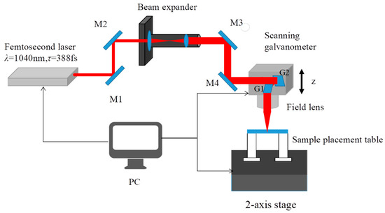 The experiments were performed on a laser processing system scanning galvanometer with a femtosecond laser (Newport Corporation SPIRIT 16-HE-SHG (Irvine, CA, USA), wavelength λ = 1040 nm, pulse duration τ = 388 fs, pulse repetition rate f = 100 kHz). The platform was driven by a 5-axis system (X, Y, Z axes and x, y axes); the X and Y axes consisted of a two-axes stage with a 200 mm travel range, 1 µm minimum displacement, and 1.5 µm repeat positioning accuracy, which we used to move the sample arbitrarily in the X and Y axes. The Z axis was driven by a vertical Z-orientation positioner (with 1 µm resolution) to control the vertical position of the laser focus. Along axes x and y, we moved the G1 and G2 mirrors quickly using a scanning galvanometer (Scanlab IntelliSCAN 10 (Puchheim, Germany), 15 mm numerical aperture, 72 mm scanning displacement, 1.2 ms reaction time, and 6 m/s maximum scanning speed), to control the etching path of laser beam on the materials. The collimated near-infrared laser beam passed through mirrors M1 and M2, and then entered the beam expander (beam expansion ratio 1:4). After that, the laser beam was focused onto the scanning galvanometer through mirrors M3 and M4. Finally, it was focused on the sample surface through a field lens (f = 100 mm). We investigated the femtosecond-laser-etched microgrooves with diverse depth-to-width ratios on the surface of quartz glass etched with a single-line etching method. The experimental material was JGS1 quartz glass wafer, with a diameter of 25 mm and a thickness of 0.25 mm. Before the experiment, the sample surface was wiped with hydrated alcohol to remove impurities to ensure the sample surface was clean. A schematic of the experimental setup is shown in Figure 1.