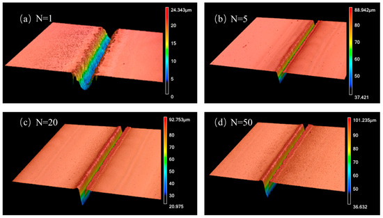 Three-dimensional images of microgrooves obtained with single-pulse laser energy Ep = 40 μJ and scanning velocity v = 100 mm/s with the following number of exposures: (a) N = 1, (b) N = 5, (c) N = 20, (d) N = 50.