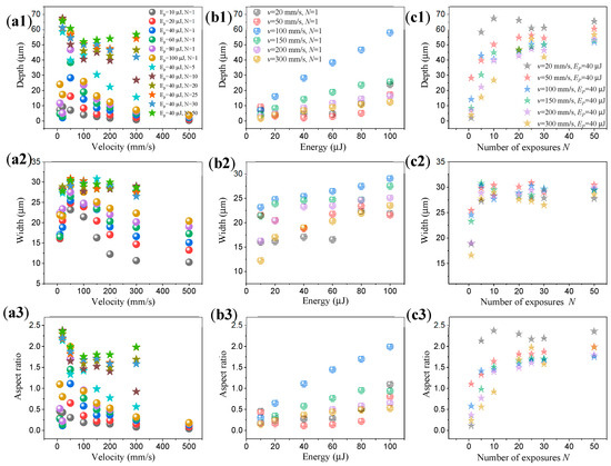 The interdependence of the three physical properties with the characterization (depth, width and aspect ratio) of the laser etching results: (a1~a3) share a legend with (a1); (b1~b3) share a legend with (b1); (c1~c3) share a legend with (c1).