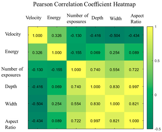 where cov(X, Y) denotes the covariance of X and Y. These six parametric approaches were analyzed statistically. The Pearson correlation test coefficients of each parameter are shown in the heat map in Figure 4. As a result, there was no strong correlation (P ~ 1.0) between any of these features. In this experiment, it was found that the Pearson correlation coefficients among the features were relatively low. So, all of them were retained since each feature contributed individually to the model. Simultaneously, the output exhibited a very weak linear connection with the input variables.
