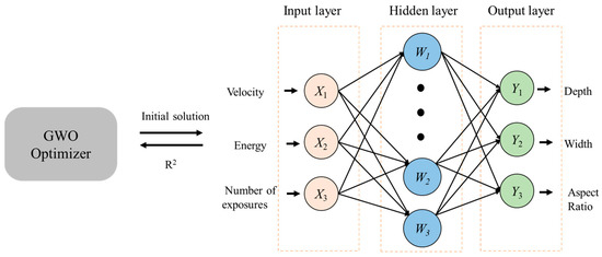 The Keras application programming interface (API) Python library was used to develop the GWO-BPNN model for predictions of laser etching parameters. The BPNN consists of three layers: an input layer, a hidden layer, and an output layer, which is shown in Figure 5. Notably, the hidden layer can have multiple layers. X1, X2, …, Xn represent the input values of the BPNN. W1, W2, …, Wp represent the hidden layer nodes; and Y1, Y2, …, Ym represent the output values. It is worth noting that dropout was applied during GWO-BPNN training to reduce the model’s dependence on the initial data and improve its generalization ability.