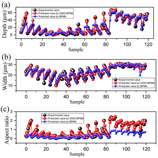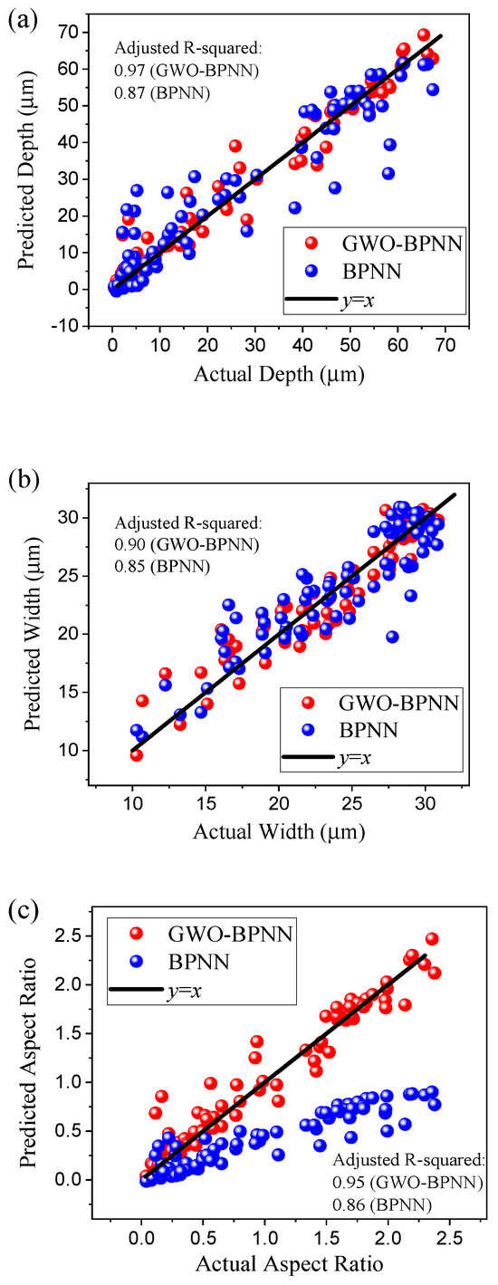 Figure 6 presents a comparison between GWO-BPNN- and BPNN-predicted values and the experimental data on the training sets and testing sets. It can be seen that with GWO-BPNN, all the data points are densely distributed along the black line of y = x, implying the equivalence between the predicted values and the actual data. In comparison, the predicted values of BPNN are quite dispersed, leading to a substantial deviation between the predicted aspect ratio values and the actual aspect values. In the predicted depth, the adjusted R-squared of GWO-BPNN was 0.97, which is higher than the 0.87 of BPNN. Similarly, the adjusted R-squared of GWO-BPNN for the predicted width and aspect ratio were 0.90 and 0.95, but 0.85 and 0.86 for BPNN, respectively. The closer the adjusted R-squared value is to one, the better the model fit. Therefore, compared to BPNN, the GWO-BPNN model demonstrated a superior ability to perfectly predict the depth, width, and aspect ratio of the microgrooves. Additionally, no outliner was observed for any of the features.