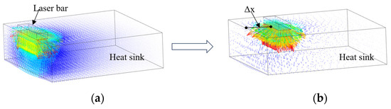 Figure 3. A schematic diagram of heat flow conduction in heat sink after the LD bar generates heat. (a) The bar is in the original package state, and the heat flow can only be conducted downward and backward in large quantities. (b) The LD bar packaging position moved back a certain distance; at this time, the heat generated by the LD bar can be diffused and conducted around, which facilitates the transfer of the bar heat and reduces the temperature of the LD bar.
