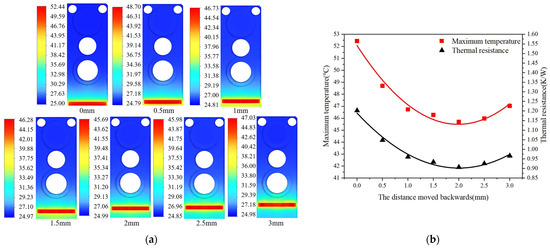 Figure 4. Influence of bar rearward shift by different distances on temperature of semiconductor lasers. (a) Nephogram of temperature distribution of packaging structure at different bar rearward shift distances. (b) Fitting curves of maximum temperature and thermal resistance of the bar at different packaging positions.