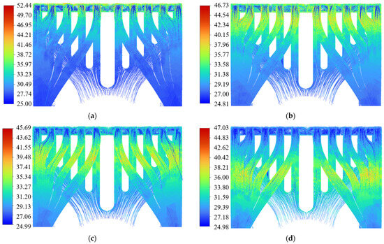 In the range of 0–2 mm, the temperature of the chip dropped significantly with the increase in the rearward shift distance. When the LD bar rearward shift distance reached 2 mm, the maximum temperature and thermal resistance of the LD declined by 6.75 °C and 24.6%, respectively, compared to those before rearward shift, suggesting an improvement in the overall heat-dissipation performance of the LD. However, when the LD bar rearward shift distance exceeded 2 mm, the maximum temperature of the laser started to rise again, which is mainly attributed to the effect of the MCHS structure. Figure 5 is the trace diagram for the thermal simulation results at the LD bar rearward shift distances of 0 mm, 1 mm, 2 mm, and 3 mm. Apparently, when the LD bar rearward shift distance reached 2 mm, the effective conduction area of the LD bar temperature to the water flow region was larger than that at the bar rearward shift distances of 0 mm, 1 mm, and 3 mm. When the LD bar rearward shift distance was 0 mm, the heat generated by the bar could only be conducted downwards and rearwards. In the case of the LD bar rearward shift distance of 2 mm, the heat generated by the bar could be conducted forwards, as well as downward and rearward. However, when the LD bar rearward shift distance reached 3 mm, the heat-dissipation capacity decreased along with the rearward conduction of the heat generated by the LD bar due to the shrinkage of the fluid channel and changes in the internal structure of the MCHS. Hence, it is evident that the maximum temperature would rise continuously if the LD bar continued to move rearwards.