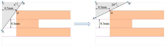 According to the research described above, the temperature peaked near the light-emitting surface of the chip, where heat dissipation was worst, before the rearward shift of the LD bar. Through the LD bar rearward shift, the overall heat-dissipation performance of the LD, as well as the heat-dissipation capacity near the light-emitting surface, is enhanced, but the light-emitting path in the front cavity is blocked [32]. It is a simple and feasible method to cut the part that blocks the light. When studying the cutting angle and cutting distance, it must be first ensured that it will not affect the microchannel structure. That is, the gray part (cutting part) and the orange part (microchannel heat sink internal channel structure) in the figure do not overlap. Combined with the fact that the above-mentioned laser bar’s fast axis divergence angle is less than 39°, the cutting angle must be greater than or equal to 20°. Otherwise, it will still affect the light. Combined with Figure 1a, it can be seen that when the cutting angle is greater than 45°, the heat flow diffusion path is obstructed, so the cutting angle is better in the range of 20–45°. Cutting research is carried out in a limiting way (the gray part just touches the orange part and intersects at point D). It can be clearly seen in the figure that as the cutting angle x (x > 20) decreases, the distance (BC) that the bar can move backward increases, which can be simplified as a straight line AB rotating around point D. When the cutting angle’s limit is 20°, the backward distance reaches the maximum (B’C) of 1.324 mm. Combined with Figure 4b, it can be seen that within the range of 0–2 mm retreat, the maximum temperature shows a downward trend with the increase in the retreat distance. In summary, the cutting angle of 20°is a better choice, as shown in Figure 6.