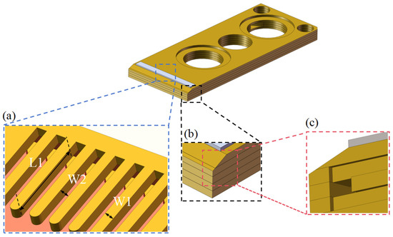 Moreover, key parameters designed for the MCHS, namely a ridge width W1 between channels, channel width W2, and channel length L1, were selected for an influence study, as shown in Figure 7. The ranges of W1, W2, and L1 were 0.1–0.5 mm, 0.1–0.5 mm, and 0–4 mm, respectively. In this study, W1 and W2 were independent of each other. Changing either W1 or W2 would give rise to variations in the number of microchannels and fins.