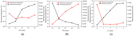 Figure 8. Influence of parameters on maximum temperature and maximum pressure of the MCHS. (a) Effects of W1 on the maximum temperature and pressure of the MCHS. (b) Effects of W2 on the maximum temperature and pressure of the MCHS. (c) Effects of L1 on the maximum temperature and pressure of the MCHS.