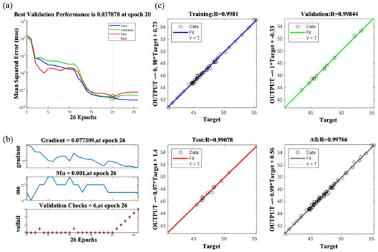 Figure 9. The model training results. (a) Neural network training error MSE results; (b) neural network training results; and (c) neural network model fitting results.