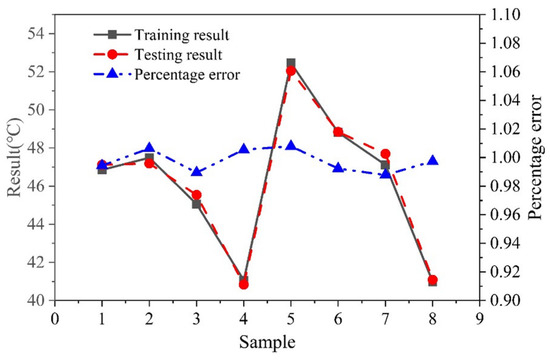 Figure 10. Training results and test results, together with corresponding error curves. The blue dots represent the percentage error between the training results and the test results.