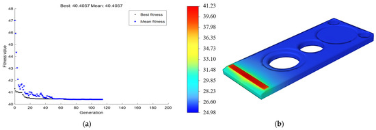 Figure 11. Optimal parameter combination. (a) The optimal result was obtained by combining a neural network and GA, and the maximum temperature was 40.4057 °C. (b) The optimal parameter combination test results. The highest temperature is 41.23 °C.