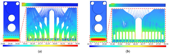 As shown in Figure 8c, the maximum temperature dropped rapidly when L1 rose from 0 mm to 1 mm, while it fluctuated slightly at 1–4 mm. An elevation in L1 could increase the effective heat conduction area of the outlet’s layer and top layer, as well as the convective heat transfer area between the microchannel wall and the coolant liquid. When L1 was greater than 1 mm, the heat transfer approached an equilibrium state. The maximum pressure of the HPLD rose rapidly and then tended to be stable, peaking (0.0569 MPa) at 4 mm. This value is far lower than the safe value (0.72 MPa).