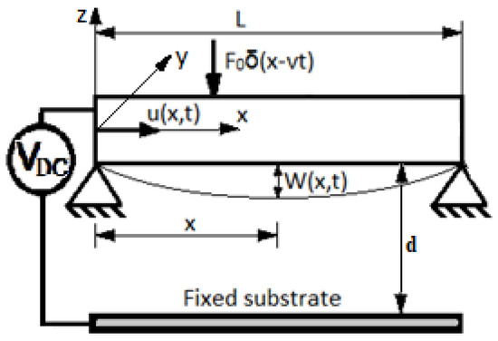 where v is the speed of the load, and δ is the Dirac function. The vibration of the microbeam depends on the action of the DC voltage source, such that electromagnetic actuation can be considered as