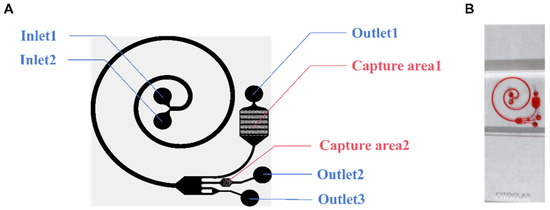 Ideally, when injecting cell suspension from Inlet 2 and cell separation from Inlet 1, red blood cells (RBCs) and nucleated cells are first separated, and then, the RBCs are removed from the chip along the outside of the channel. The remaining cells then follow the channel into another part of the chip, known as the capture area. There are two capture areas where solids are trapped as the fluid passes through. Without any additional requirements, the chip completely relies on continuous inertial microfluidics to achieve a high concentration and purification of tumor cells.