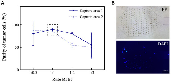 The different types and amounts of cells (such as red blood cells, white blood cells, and tumor cells) found in MPEs are related to the diseases that patients suffer from. In this study, we developed a microfluidic chip for analyzing MPEs. To investigate the characteristics of the device for the separation and concentration of pleural effusion cells, an A549 suspension and a separation solution were injected into the microfluidic chip at the flow rate ratios of 1:0.5, 1:1, 1:2, and 1:3, respectively. The volume of the cell suspension was kept at 2 mL and the total flow rate at 6 mL/h. The purities of A549 in the capture areas of the chip were then calculated separately (Figure 2A). Purity is defined as the ratio of tumor cells to the total number of cells in the capture area (Formula (1)). As shown in the results, the purity of A549 in both Capture area 1 and 2 tended to be 95% when the ratios of cell suspension to separation solution were 1:0.5 and 1:1. However, repeated experiments showed that it was more stable at 1:1. Hence, the ratio of 1:1 was chosen for subsequent studies.
