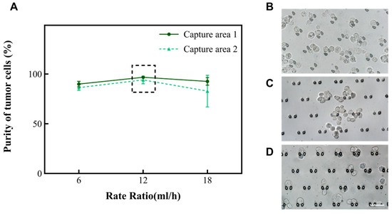 According to the principle of hydromechanics, the structure of the microfluidic chip helps the fluid to drive cells in the suspension in different directions. Smaller cells (like red blood cells and small white blood cells) will move along the outer wall of the channel, while larger cells (like large white blood cells, mesothelial cell and tumor cells) will move along the inner wall of the channel toward the capture areas. Subsequently, we altered the total rate at which the chip operated to 6 mL/h, 12 mL/h, and 18 mL/h to explore the purity of A549. The results are shown in Figure 3A. Nevertheless, when the rate of the injected chip reaches 18 mL/h, there is the phenomenon of a deformation of the cells due to the effect of an increased pressure. Fewer cells enter the capture areas at a rate of 6 mL/h (Figure 2B). In summary, the microfluidic chip performed effectively when the total rate of the injection device was 12 mL/h and the ratio of the rate of suspension to separation solution was 1:1. At this time, the purity of A549 was enhanced from 30% to 94.1~96.8% in the captured areas (Table 1). Subsequently, this research also analyzed the performance of this chip on two other types of tumor cells (MCF-7 and Hela). It was found that the purity of MCF-7 could be enhanced to 98.5~99.3%, and the purity of Hela cells could be enhanced to 98.1~98.7%. Moreover, the cell clusters were also able to be intercepted in the capture area of the microfluidic chip (Figure 3B–D). To ensure the accuracy of the results, the tumor cells in the cell clusters were also counted individually under a microscope.