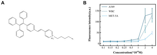The structure of TPN and its ability to identify tumor cells. (A) The chemical structure of TPN. (B) Fluorescence intensity changes in cell lines incubated with different TPN concentrations, including cancer (A549) and non-cancer cell (WBC and MET-5A) lines.