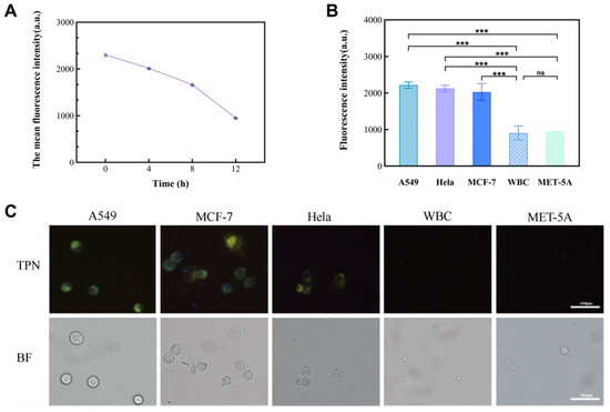 The significance of the fluorescence intensity changes observed in different cell lines. (A) Fluorescence intensity of TPN-labeled A549 cells over time (0–12 h). (B) Comparison of fluorescence intensity between tumor cell lines (A549, MCF-7, and Hela) and non-tumor cell lines (MET-5A and WBC) (n = 9, *** p < 0.001, Statistical insignificance was defined as ns). (C) Images of five TPN-labeled cell types (BF, bright field; TPN, fluorescence field).