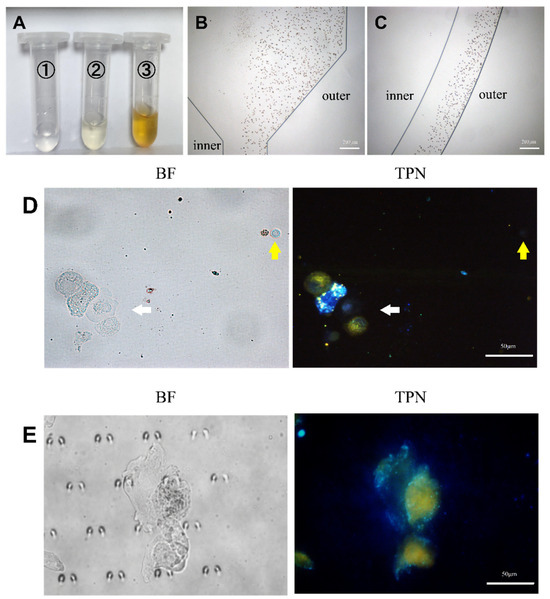 Analysis of pleural effusion. (A) The pleural effusion was processed by the microfluidic device and collected from the microfluidic outlet (①, ②, and ③). (B,C) Trajectories of RBCs in the microfluidic chip. (D) TPN-labeled pleural effusion cells before chip processing. The white arrow indicates the cluster of tumor cells in pleural effusion. The yellow arrow indicates WBC with RBC to the left, and both were fluorescence-negative. (E) Tumor cells captured on the microfluidic chip (BF, bright field; TPN, fluorescence field).