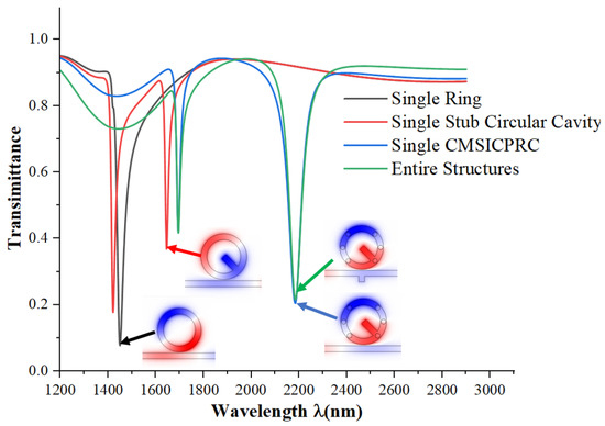 Transmission spectra of single ring, single stub circular cavity, single CMSICPRC, and all systems.