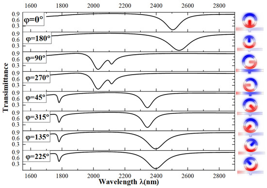 First, we adjusted the angle φ of the single short bar inside the circle, varying φ from 0° to 315° in steps of 45°. The results are shown in Figure 4. We found that the transmission spectra are similar in pairs. When the angls are 0° and 180°, the transmission spectrograms are more similar. There is only one resonance valley from 1700 nm to 2900 nm, with the wavelength near 2500 nm. The calculated sensitivities are 2330 and 2367 for 0° and 180°, respectively. When the angles are 90° and 270°, the transmission spectra are very similar. There are two valleys, but they are close to each other, making the working wavelengths too close to show good sensor performance. Therefore, we do not consider the results for these two angles. We observed that the troughs at angles 45° and 315° are a bit sharper than those at 135° and 225°, indicating a better Fano resonance. We then plotted the transmission spectra for 45°, 135°, 225°, and 315° together in Figure 4 and found that they are almost the same with only minor differences. The sensitivities at 45° and 135° are calculated to be 3160 and 3360, respectively, while the FOMs are 50 and 32, respectively. Although the sensitivity at 135° is 0.063 higher than that at 45°, the FOM value is 0.56 lower. Therefore, we decided to study the structure with the short bar at 45°.