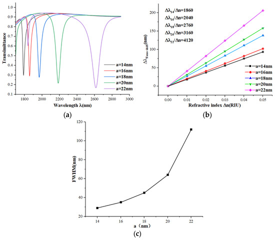 Next, we modeled the effect of the radius of the circle inside the ring (a) on the performance of the sensor based on the simulation and computational results. We set the radii of a to 14, 16, 18, 20, and 22 nm, and the generated spectrograms are shown in Figure 5a. It is clear that the transmission spectrum undergoes a larger redshift and moves downward as a becomes larger, as seen in Figure 5b. As the radius increases, the sensor’s sensitivity also increases with larger step sizes. However, Figure 5c shows that the FWHM gradually expands, with the FWHM at 22 nm being almost double that at 20 nm. The FOM for 22 nm is calculated to be only 70% of that for 20 nm. To summarize, a circle radius of 20 nm provides the best overall performance.