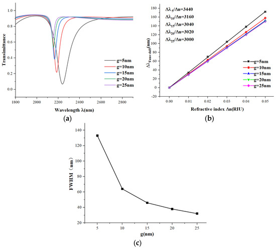 Next, we studied the effect of the coupling distance g between the waveguide and the entire structure. We increased the coupling distance g from 5 nm to 25 nm in steps of 5 nm. From Figure 7a, it is clear that as the coupling distance increases, the transmission spectra are blue-shifted, and the trough position shifts upward. The transmittance also increases with g, indicating that the coupling effect and the electric field strength are weakening. Figure 7b shows that as the coupling distance increases, the sensitivity gradually decreases, but the rate of reduction diminishes. Figure 7c shows that from 5 to 10 nm, the FWHM steeply reduces by more than half, and then the reduction rate decreases. Based on this analysis, we choose 10 nm as the coupling distance for a relatively good low transmittance performance.