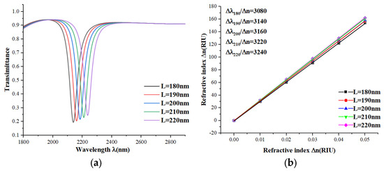 Next, to study the effect of specific parameters more deeply, we adjusted the length L of the single short bar from 180 to 220 nm in steps of 10 nm without changing the other parameters. From the transmission spectra plots in Figure 8a and the sensitivity fitting curves in Figure 8b, we can see that the transmission spectra undergo a slight equidistant redshift and shift upward as the length increases, with the sensitivity becoming slightly larger, but the FWHM remains almost the same. From this, we conclude that the length of the single short bar is also a factor affecting the sensor parameters. Within the range of 180 to 220 nm, the longer the single short bar, the better the sensor performance.