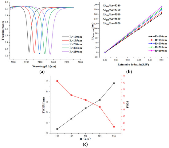 Finally, we modeled the effect of the large circular radius R on the performance of the sensor based on the simulation and computational results. (always keeping R − r = 50 nm). We start with a large circular radius R = 190 nm, which is increased in steps of 5 nm up to 210 nm. We can see from Figure 9a that as the radius R increases, the position of the wave trough is red-shifted, and the sharpness decreases, and from Figure 9b, the sensitivity increases as the radius R increases. But, as can be seen from Figure 9c, as the radius R increases, the FWHM increases and the FOM decreases. Based on this analysis, the sensor has the best overall performance when the radius R is 190 nm.