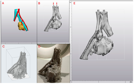 A CT scan of a patient with a complex pelvic chondrosarcoma close to the iliac bifurcation was obtained. The patient had a 3D-printed model used in their surgical planning, which is outside the purpose of this report. The CT scan was segmented to only include structures of interest, such as the distal abdominal aorta and inferior vena cava, proximal iliac arteries and veins, and the tumor itself. These desired anatomical structures were segmented separately, ensuring each part was its own model, as depicted in Figure 2A. The volumes of each anatomical structure are outlined in Table 1. These models were then imported into a CAD program (3-matic), where they were cleaned, repaired, and smoothed as necessary. Each of the three individual anatomical parts was given a 2 mm offset, and the original model was subtracted from the inside of the larger offset piece to create a hollow part. The models were inspected for overlaps that could cause leaks between different parts and were repaired as needed to ensure the chambers remained separated. Luer lock connectors were 3D modeled and added to the models as required, with holes created to allow for injection, as shown in Figure 2B. All three parts were combined within the CAD program to create a single piece from the assembly. The final CAD model had dimensions of 11.9 × 12.5 × 18.7 cm and is depicted with rulers visible in Figure 2E.