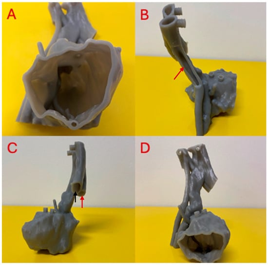 Depiction of the inside of all tumor phantom hollow chambers after support removal. This version of the tumor phantom provides views of (A) the tumor chamber interior, (B) the arterial chamber interior indicated by red arrows, and (C) the venous chamber interior indicated by the black arrow. (D) Axial view of the chamber-exposed version of the 3D-printed tumor phantom.
