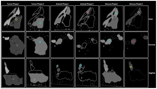 CT images of all six phases of tumor phantom in axial, coronal, and sagittal planes along with ROI placement by Rater 1 in each image depicted by colored circles.