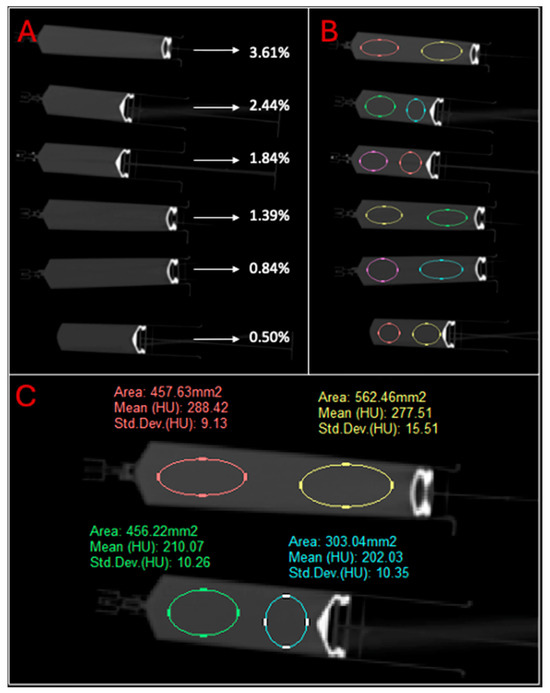 (A) Coronal CT image of contrast solution syringe gantry arrangement with concentration expressed as v/v percentage. (B) ROI placement within each syringe. (C) ROI placement for 3.61% and 2.44% contrast solution syringes shown with colored circles and corresponding labels with attenuation measurements.