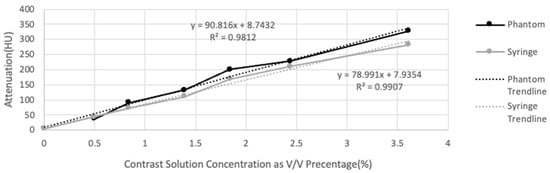 Syringes containing all the contrast solutions used in this study were also scanned with CT, as depicted in Figure 6. Two study investigators each placed two elliptical ROIs on each syringe. ROI placement was left up to the discretion of each study investigator. Each ROI was ensured to have an area of 300–600 mm2 and placed entirely within the borders of each syringe. The mean attenuation for the contrast solution in each syringe was then calculated and reported in Table 5. The attenuations of each syringe and respective tumor phantom phase were charted against the utilized solution’s concentration in Figure 7.