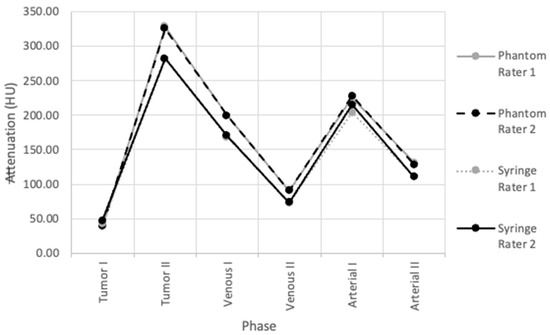 The variation in phantom and syringe attenuation data acquired by both readers was visualized by plotting the data collected by each investigator against each other for all six phases (Figure 8). The ICC values for tumor phantom and syringe attenuations were 0.9998415 and 0.9987372, respectively, which are within the ‘excellent’ reliability range (ICC = 0.90–1.00) (Table 6).