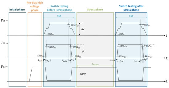 In this study, the resistive load test method was used to eliminate the phase difference between bus voltage and bus current, which can study the switching characteristics of the device more conveniently and accurately [11]. As shown in Figure 1, we identified key switching time parameters, including turn-on delay time (), current rise time (), turn-off delay time (), and current fall time (). The sequence diagram used in this study is shown in Figure 1. At the initial off state, no electrical stress is applied across the device, and no current flows. Before the first switching test, to simulate the switching process of the device at a high busbar voltage, a pre-bias high voltage consistent with the electrical stress voltage is applied to the device for less than 1 ms. The pre-bias high voltage applies electrical stress, but it has been verified that this 1 ms electrical stress does not alter the switching parameters of the device. After the pre-bias high voltage stabilizes, the device undergoes a 5 μs switching parameter test, and then, the device is subjected to continuous high-voltage electrical stress for a specified duration. Following the end of the electrical stress, a zero-delay switching test is applied to the device. The comparison of switching parameters before and after the electrical wraps up the dynamic switching test.
