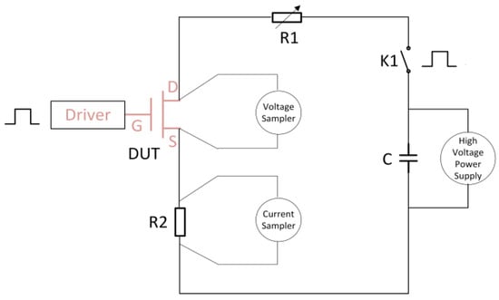 GaN devices exhibit short turn-on and turn-off times. To accurately capture the switching characteristics of GaN devices, it is essential to reduce loop parasitic distribution parameters, improve test communication speed, and utilize high-resolution and high-performance oscilloscopes. Based on the AccoTest STS8200 test platform, we optimized the test circuit design and significantly reduced the loop parasitic distribution parameters. The gate drive circuit of the device-under-test (DUT) includes a high-voltage isolated driver chip [12] to achieve a controllable turn-on and turn-off of the DUT. As shown in Figure 2, the test circuit adopts a resistive load design, through which the desired current can be achieved easily by adjusting R1. By controlling switch K1, the high voltage in the circuit can be interrupted and reconnected, and the electrical stress can be terminated before and after the test. A high-speed high-precision Tektronix MSO58 high-speed multi-channel oscilloscope was employed to measure the GS terminal voltage and GD terminal voltage in real time. The real-time loop current was monitored by detecting the voltage on the current-monitor resistor R2. The test system is capable of rapidly switching 600 V electrical stress, monitoring the entire process of voltage stress lasting over 10 s and capturing the switching parameters with high precision during the high-speed switching process.