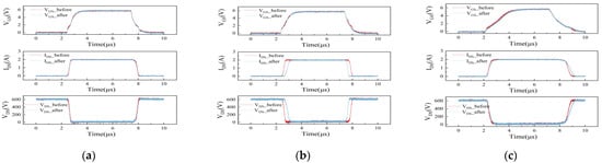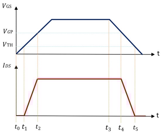 Figure 8 illustrates the timing diagram of and in the switching process of a p-GaN HEMT device. The main parameters of the switching process of the device include turn-on delay time , current rise time , turn-off delay time , and current fall time . Since the voltage and current are completely time-reversed for the resistive load test, there exists no phase difference between bus voltage and bus current in the inductive load test. The formula for calculating each time parameter is as follows [20]:
