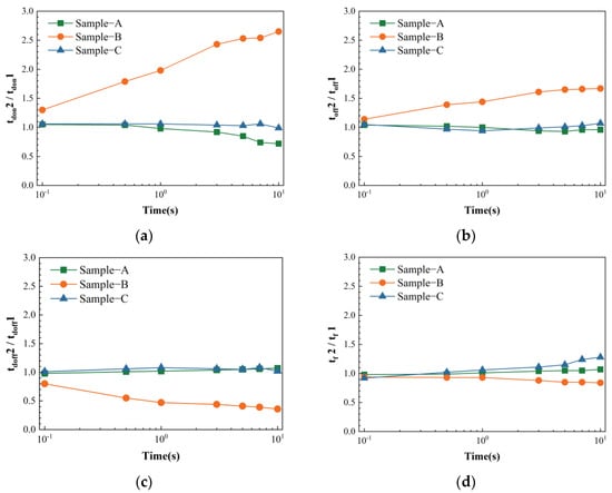 Figure 5 presents the trend in all parameters of the three devices with electrical stress time. In sample A, with increasing electrical stress time, decreases, while other parameters remain stable. In sample B, with the increase in electrical stress time, the and of sample B both exhibit an upward trend, while the decreases significantly, and presents negligible changes. For sample C, as the electrical stress time increases, the relevant parameters , , and show minimal variations, but increases significantly. The summary above indicates that as the electrical stress time increases, the rate of parameter change in the DUT increases, the device parameters exhibit a consistent monotonic trend, and the quantitative trend aligns with the waveform comparison directly collected by the oscilloscope.