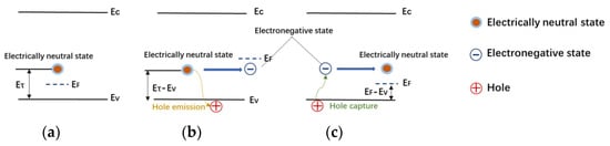 Schematic of acceptor-trap-induced capture and emission of free carrier. (a): Initial phase; (b): Stress phase; (c): Recovery phase.